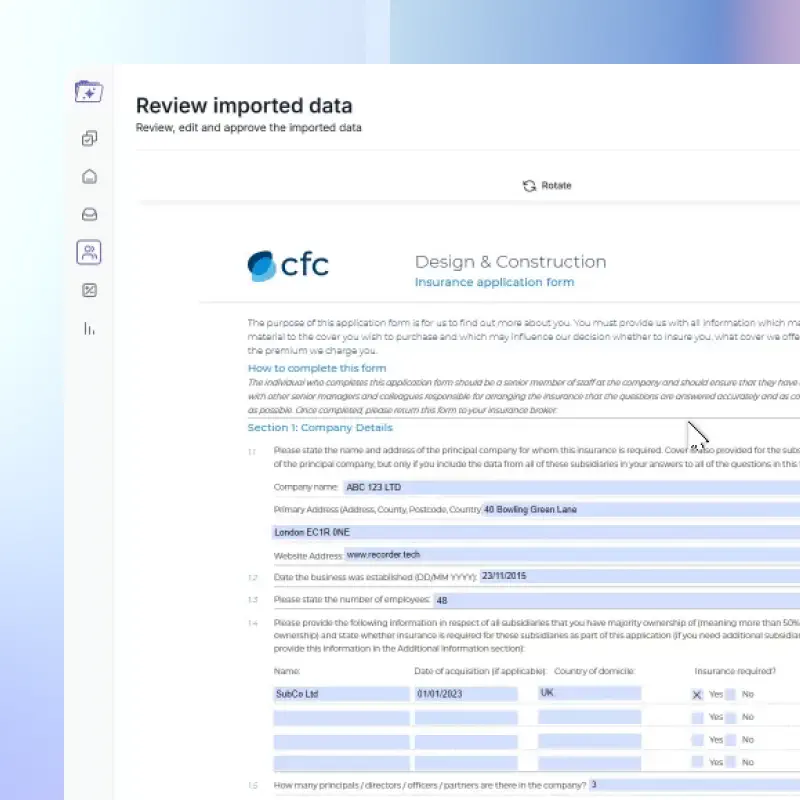 Yes, Recorder operates a ‘human-in-the-loop' review process when ingesting complex documents such as proposal forms. You always get the chance to review, amend and edit before approval.